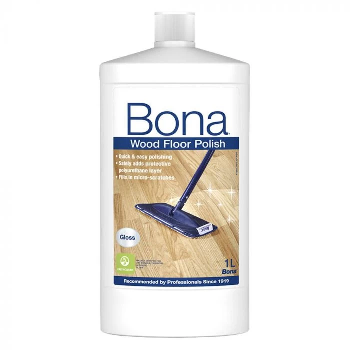 Bona Wood Floor Polish Gloss is a ready-to-use waterborne maintenance coating for varnished wood floors. It restores the shine while offering continued protection against wear.