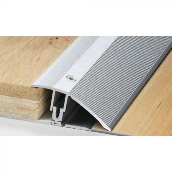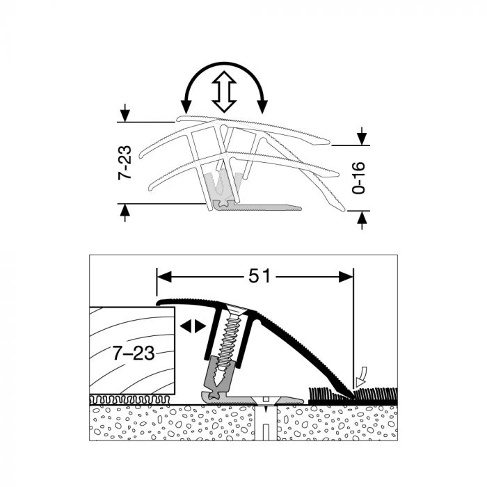 The three-part profile system automatically and infinitely levels variable height differences up to 12 mm of different floor coverings. The screw heads are flush with the base-profile even in case of high inclination, allowing an optimal positioning at any time.