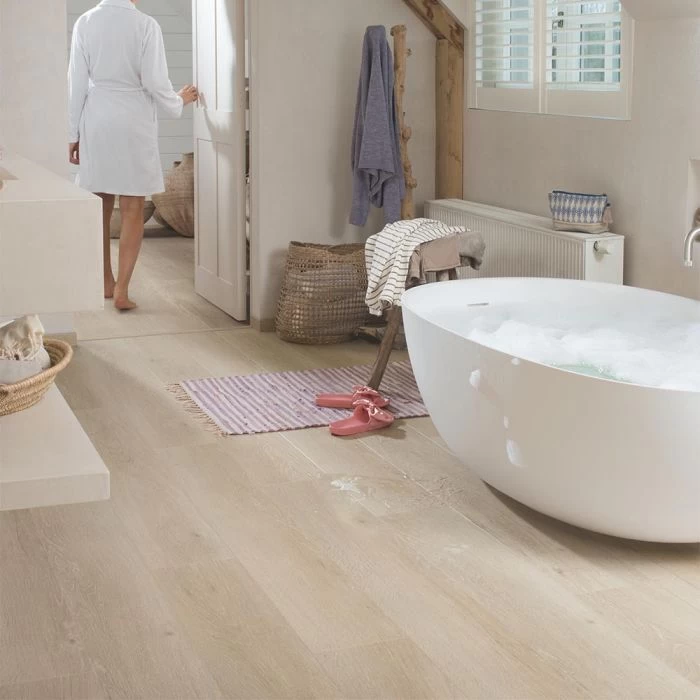 Quick-Step Livyn Alpha vinyl floors are fully water proof thanks to their advanced watertight click system. This makes them a perfect choice for wet areas such as bathrooms or kitchens.